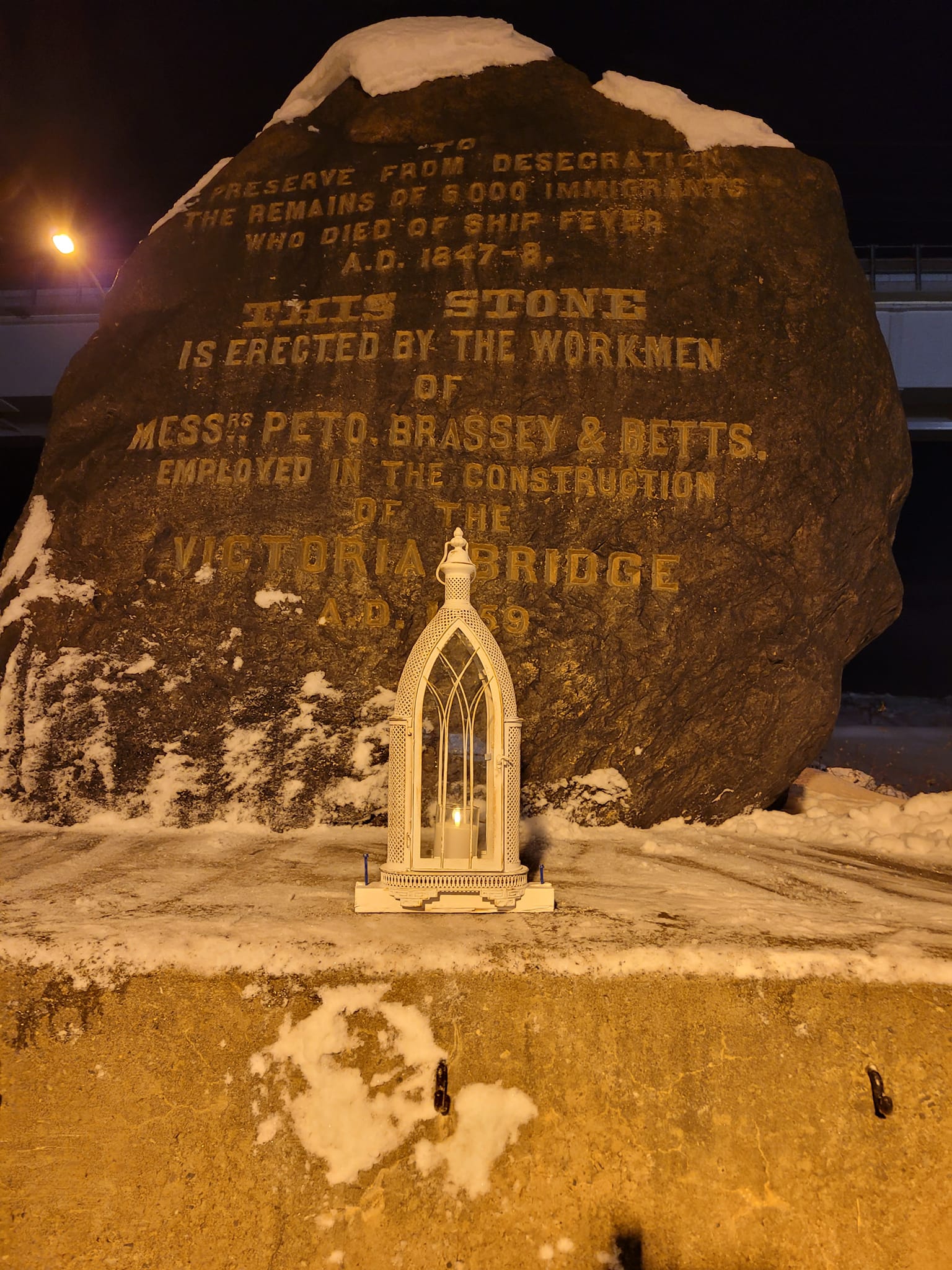 Laid as a headstone on the 1847 Irish Cemetery on the December 2, 1859 and dedicated to the more than 6,000 souls buried in a mass grave on the shores of St. Lawrence River at Windmill Point.